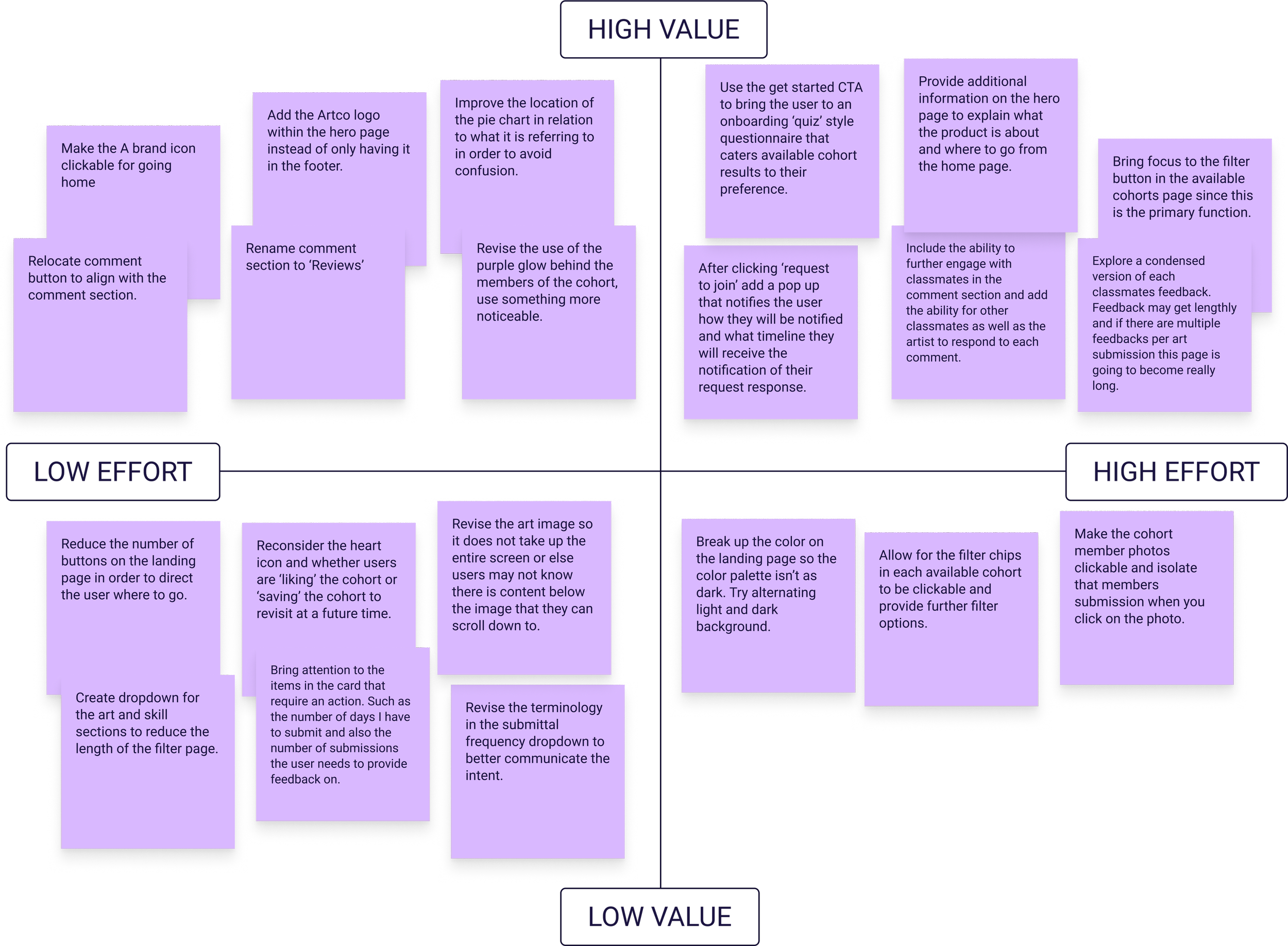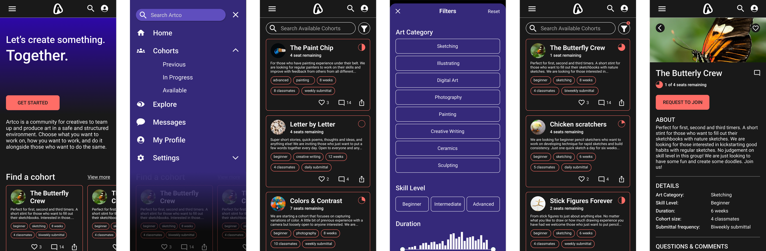 During usability testing, I identified a challenge for first-time users to intuitively find the right cohort based on their personal preferences. Typically, this task involves utilizing the filter tool on the cohorts page. In response to this discovery, I designed an onboarding experience to assist new users in selecting their preferences, mirroring the options provided by the filter tool. This enhancement aims to streamline the process and enhance the user experience for those joining Artco for the first time.