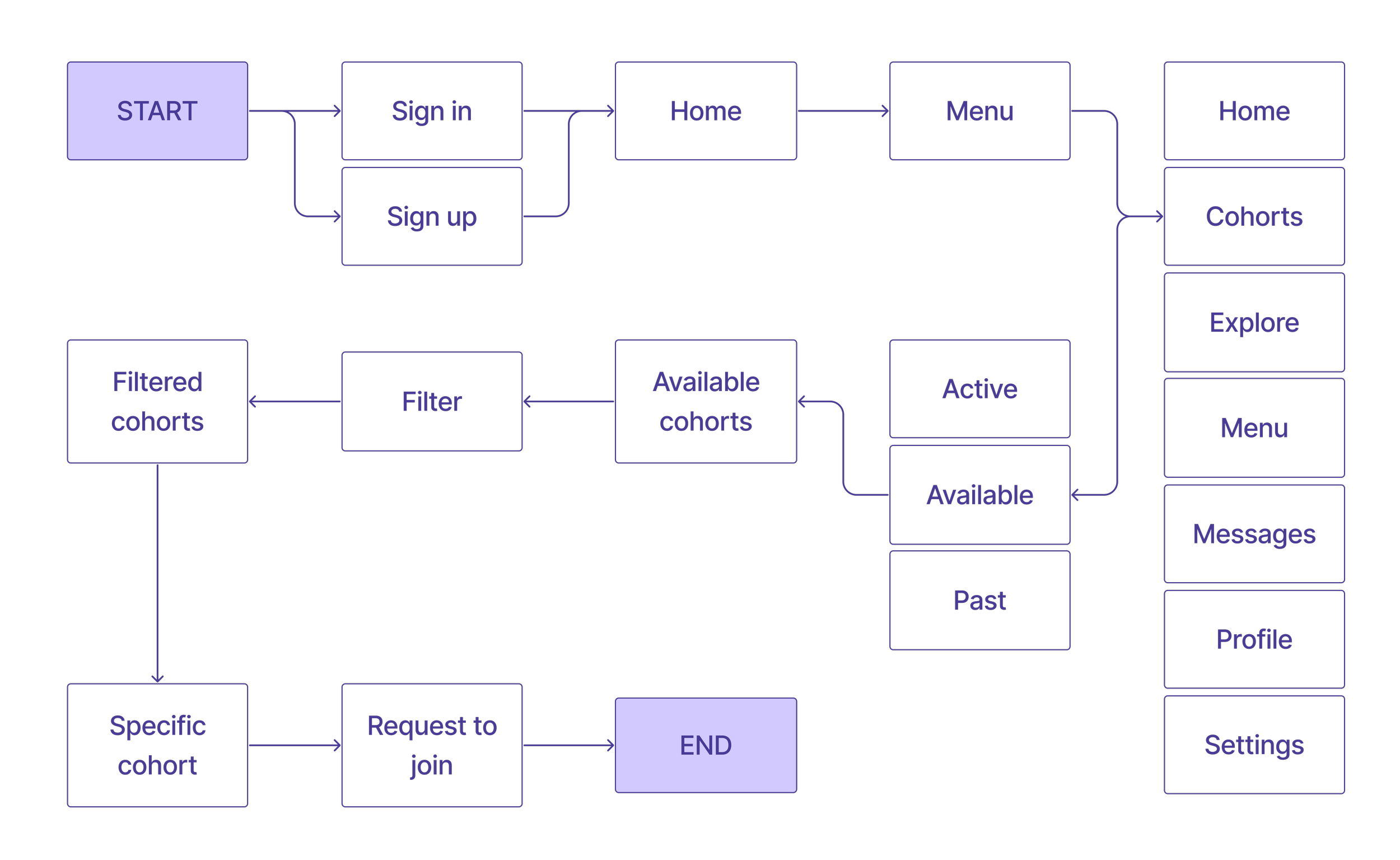 I created a user flow to understand the steps a user would experience when completing the task of joining a cohort in order to identify gaps in the user experience.