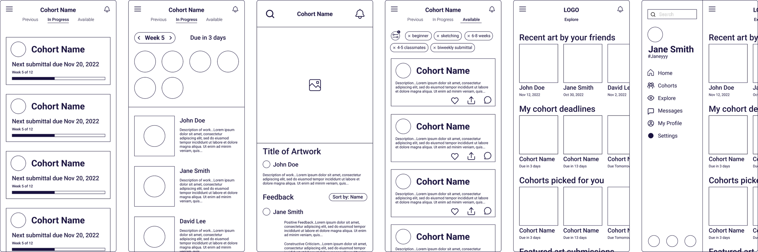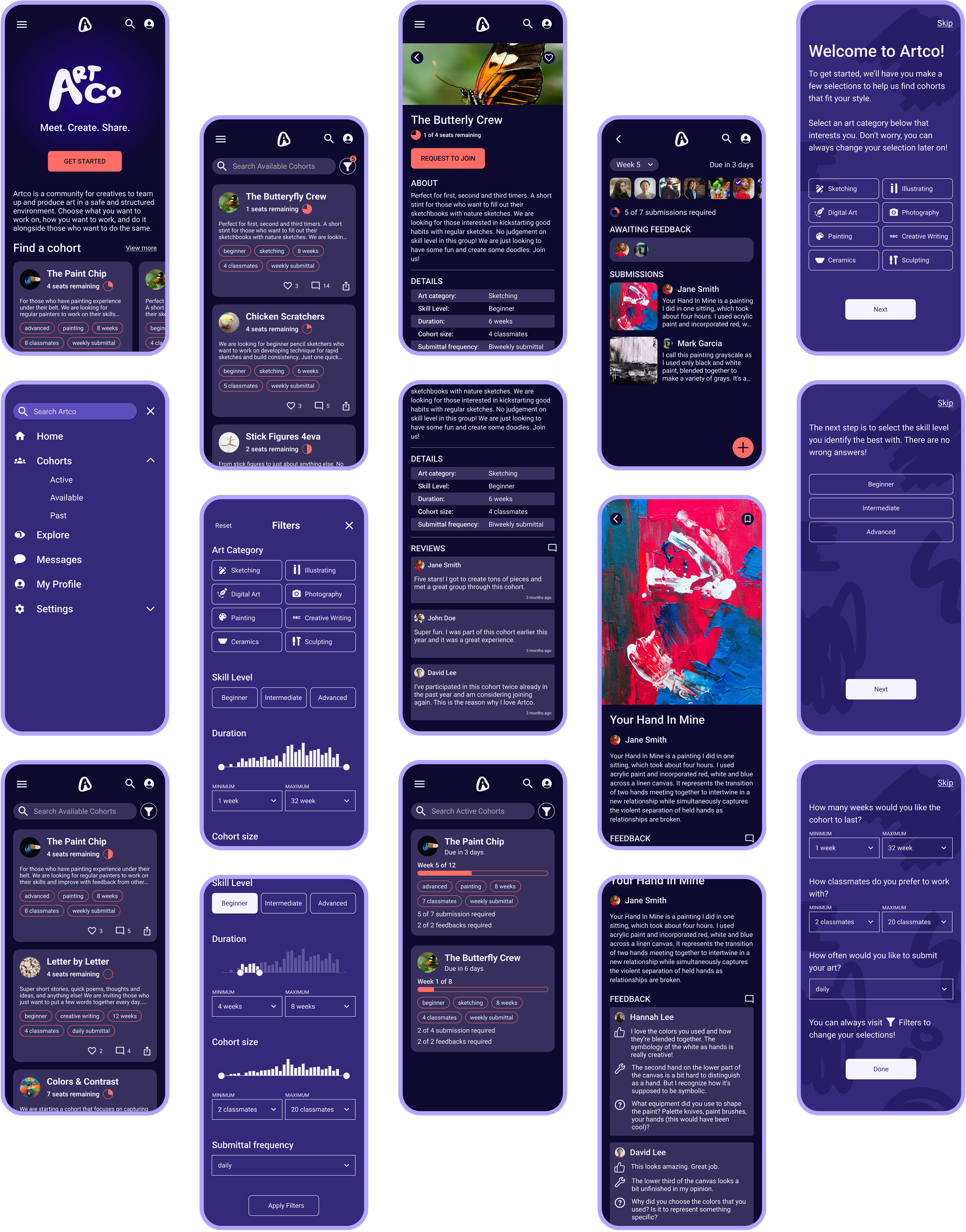 Artco fosters a sense of accountability and feedback for individuals seeking creativity by establishing structured cohorts. These cohorts consist of small groups of dedicated users committed to submitting artwork at regular intervals throughout a defined period. Artco cultivates accountability through a peer-led classroom environment and facilitates personal growth by offering regular feedback.