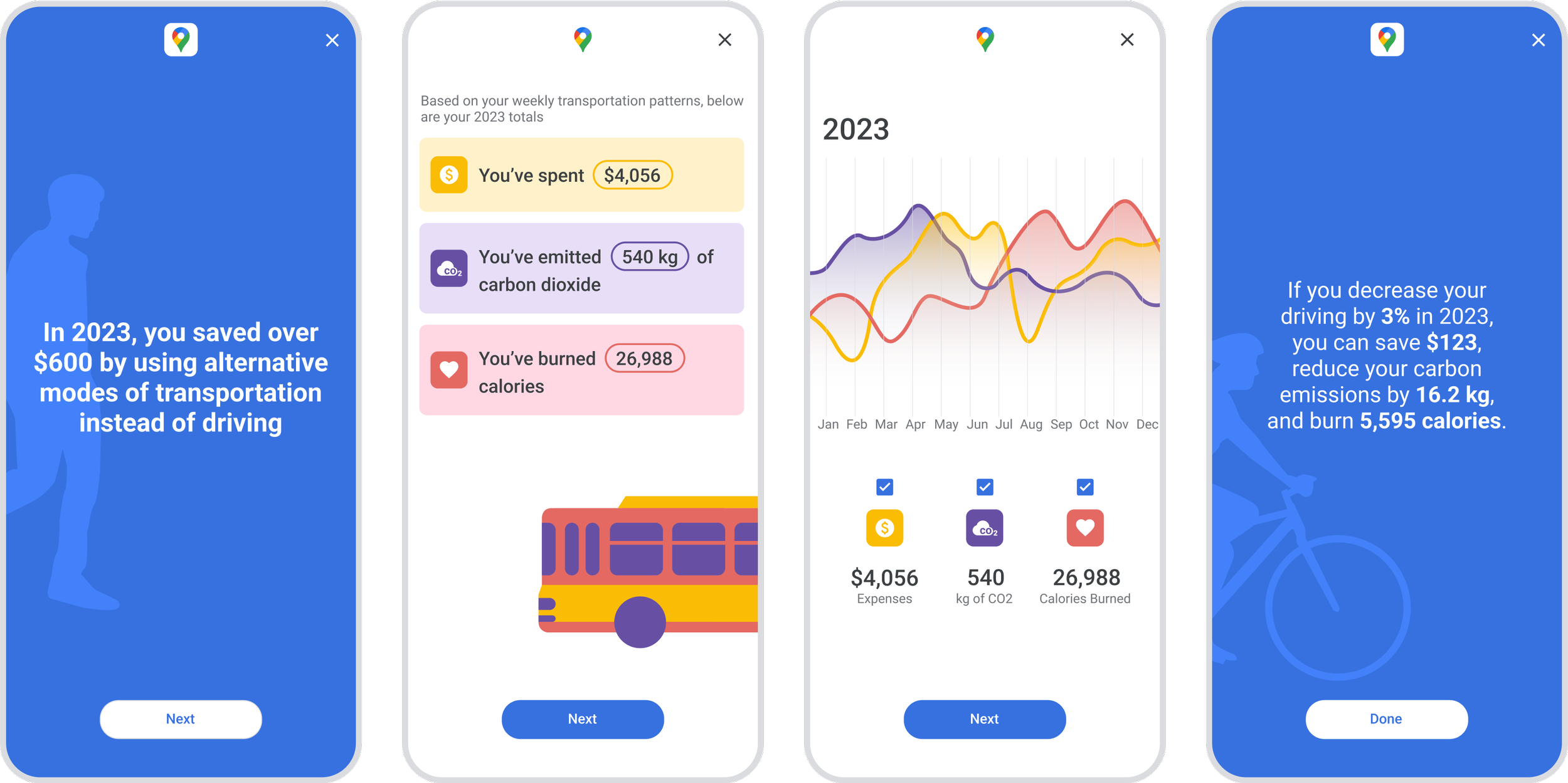 The Wrap Up feature has two primary components. The first is to introduce additional data points to route planning, including cost, carbon emissions, and health. The second is providing the user with a brief summary of their monthly and annual transportation habits to inform them of the impacts of their actions and to provide them opportunities to travel more sustainably.