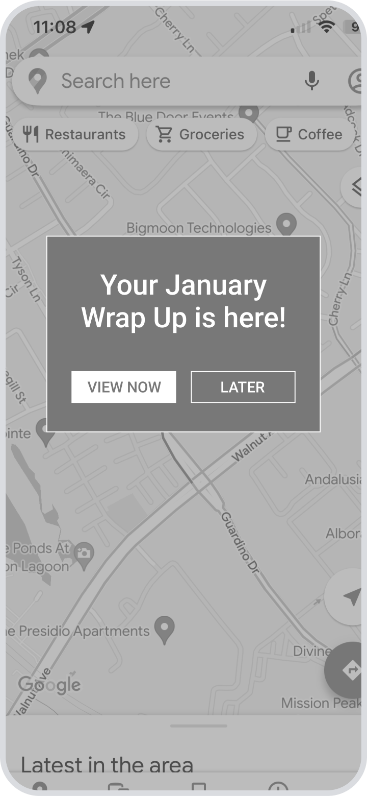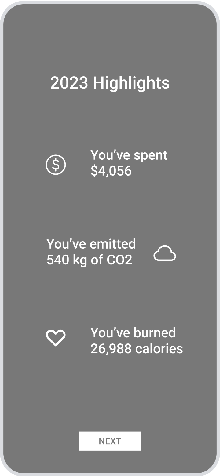 The primary goal of the wrap up feature was to communicate data to the user to raise awareness. As I became immersed with the research and findings, I forgot that data alone can be boring. User testing for this project was enlightening as I received feedback that the information I was presenting was really valuable, but there were opportunities to make it more interesting. I then explored various design approaches to incorporate animations, increase interactions and add visual interest to each screen.