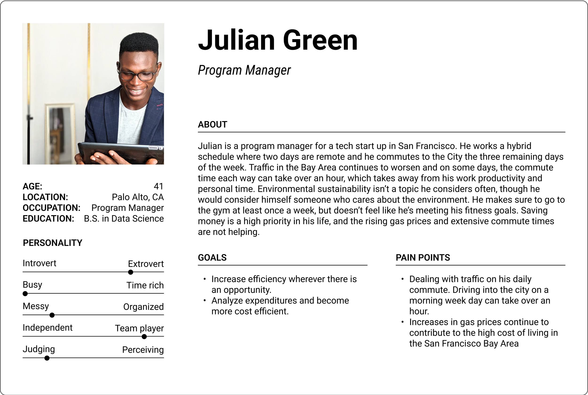 To better empathize with the target user, a persona was created that resembled regular drivers who have an interest in becoming more environmentally friendly.