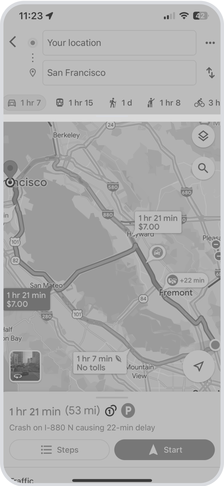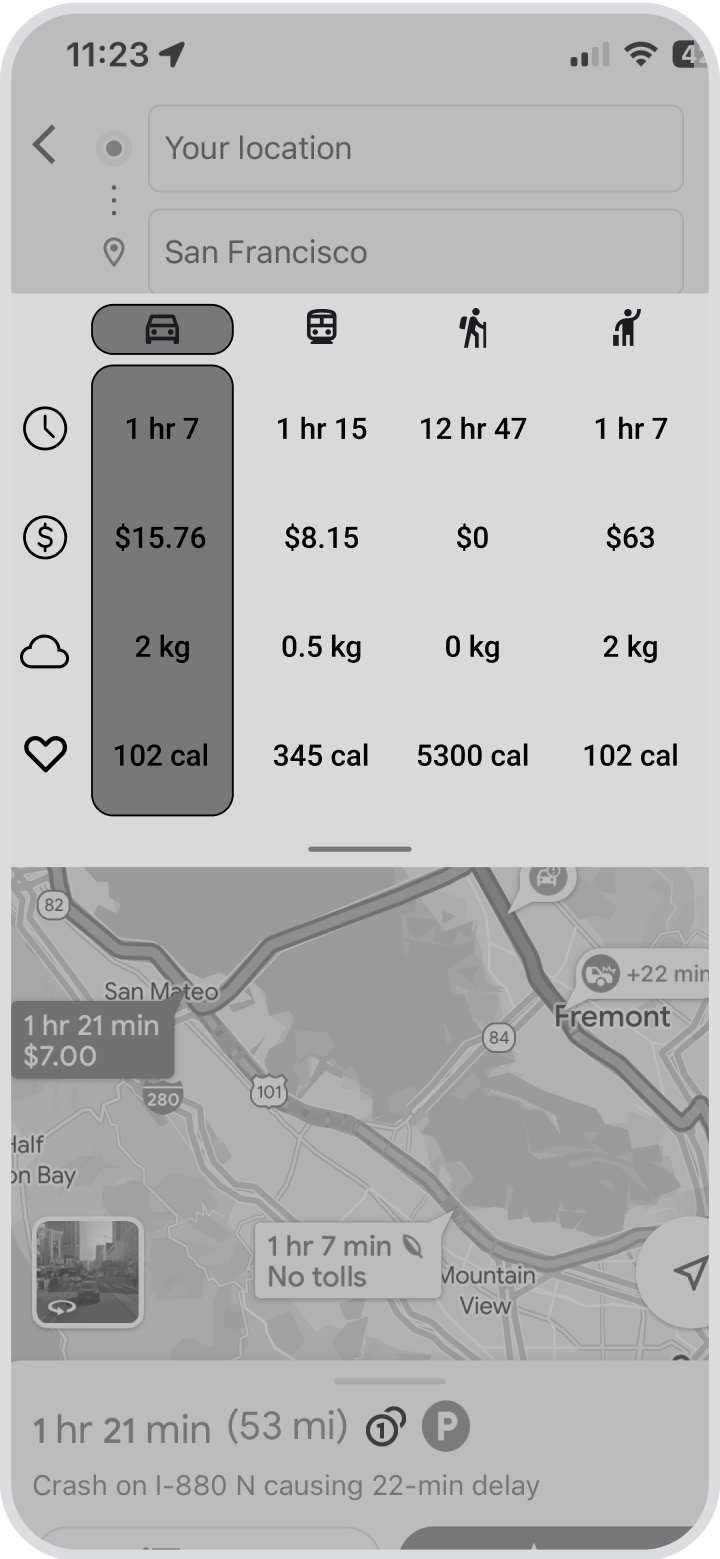 Google Map’s current interface provides one primary data point for each mode of transportation when planning a route, which is based on the duration of travel. When comparing modes of transportation, using time as the determining factor will often result in the prioritization of personal vehicles, which produce the most carbon emissions per mile among all modes of passenger transportation.