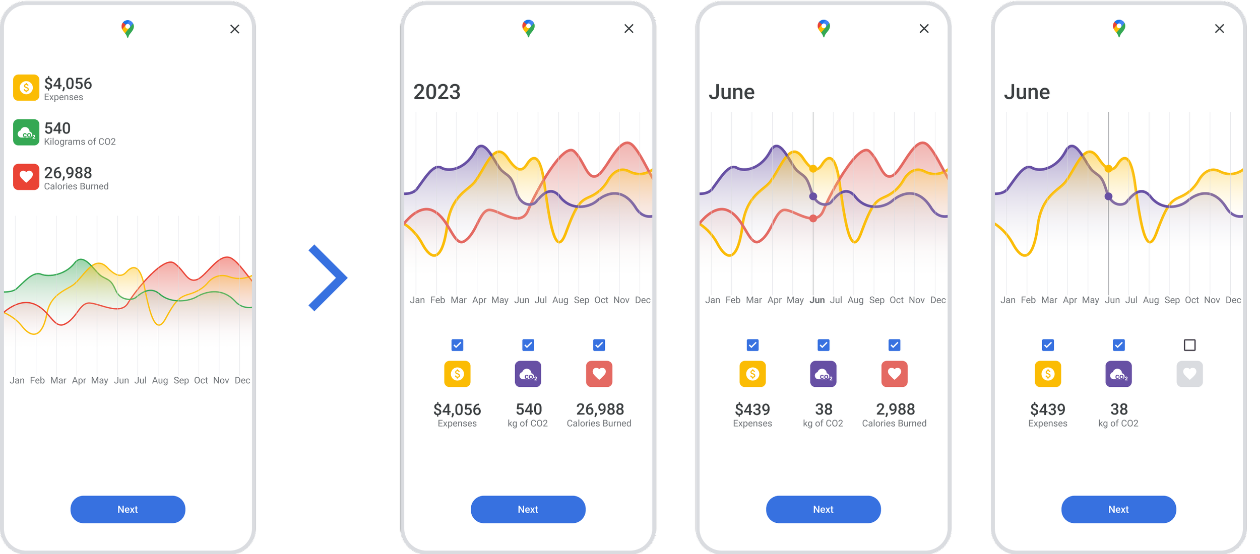 Initially, the annual wrap up providing a screen that identified a users results in all three categories for each month over the entire year. A lot of interest was received on this screen during user testing, and participant’s shared the desire to further explore the data being displayed here. The iteration allows users to see the annual results, and also the results of each month if they touch the graph. It also allows them to filter on and off the various categories in order to focus on certain data points.