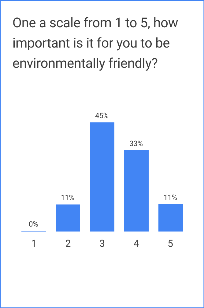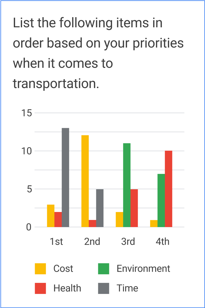A survey was conducted to gather quantifiable data regarding people’s priorities when it came to transportation what might influence them to become more environmentally friendly. 18 participants provided responses to an 8 question survey.