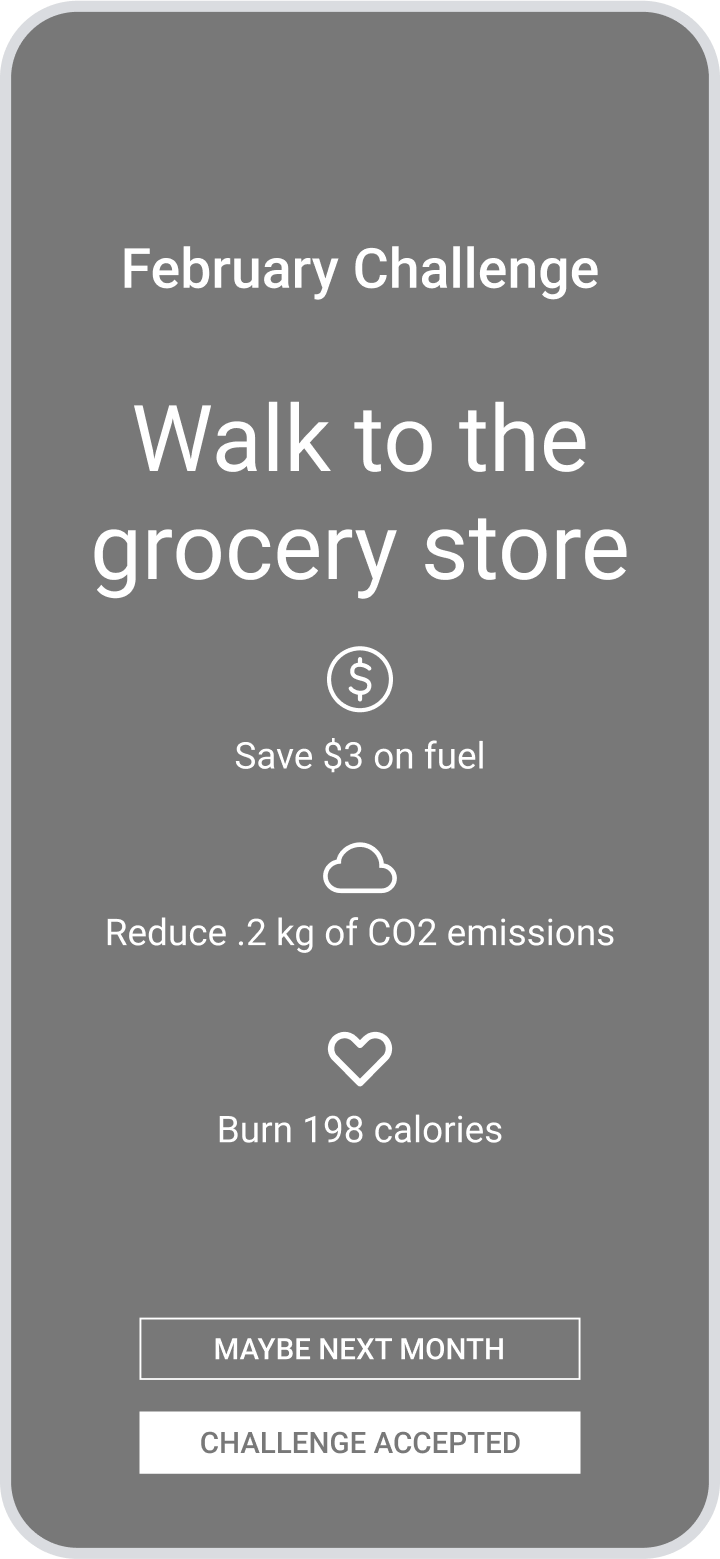 The final screen of the wrap up flow initially brought users to a challenge to use an alternative mode of transportation. User testing revealed that users may want more options for this challenge, in case they weren’t interested in the one presented. This would increase the possibility of the user finding the challenge interesting and therefore completing it.