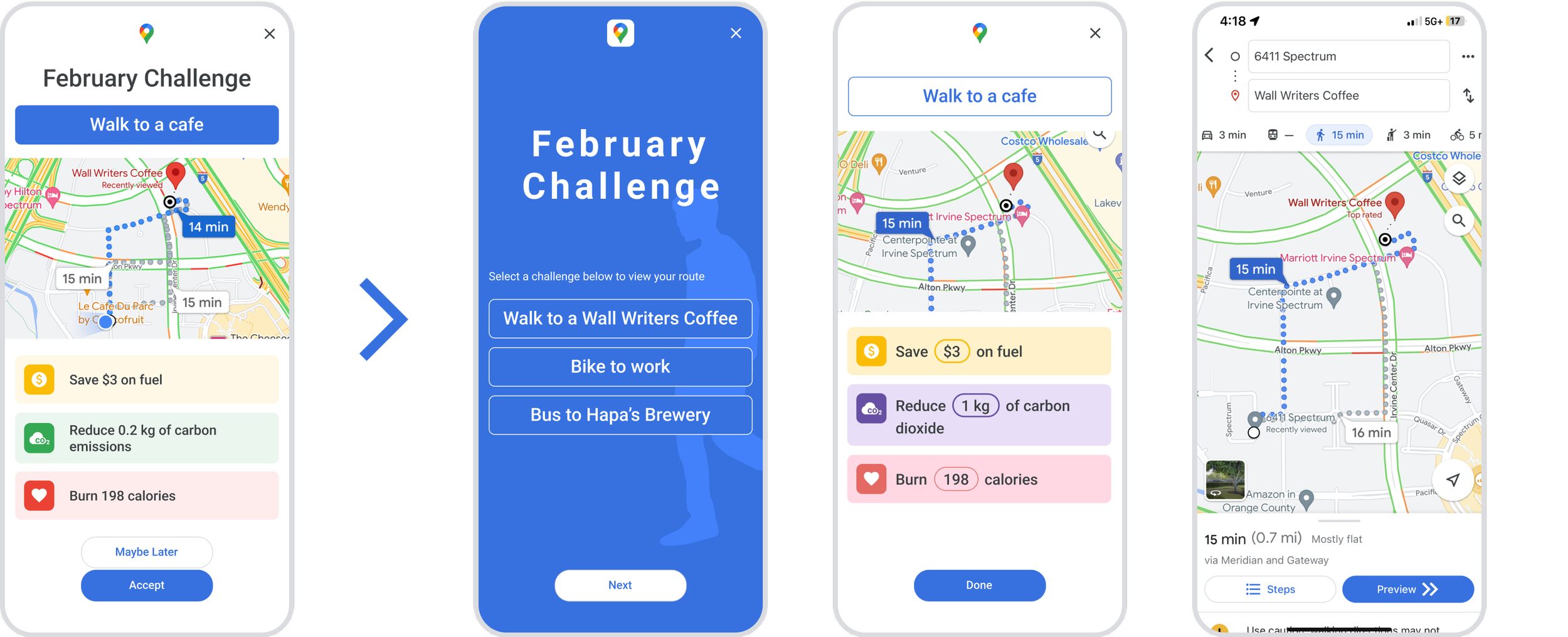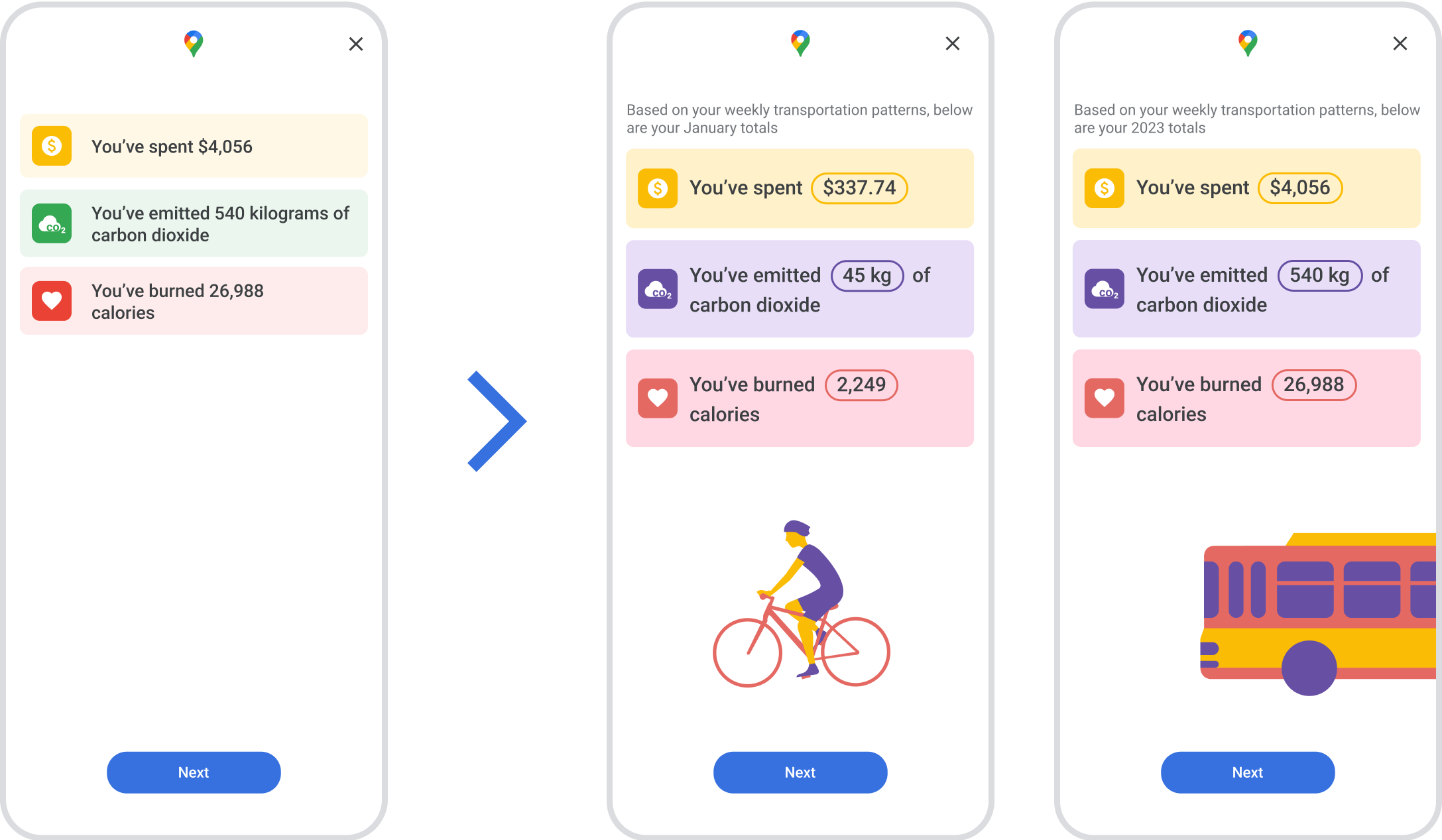 On the surface, this feature is a fun additional to a regularly used application for functional purposes. But my goal for this feature was to make a positive impact on environmental sustainability. As I began exploring opportunities on what this feature might become, I realized how much research was required to back up the additional data that I intended to communicate to the user. Research in regards to carbon emissions, exercise and transportation costs became an essential component for educating users and the hope that it would lead to raising awareness and taking action.