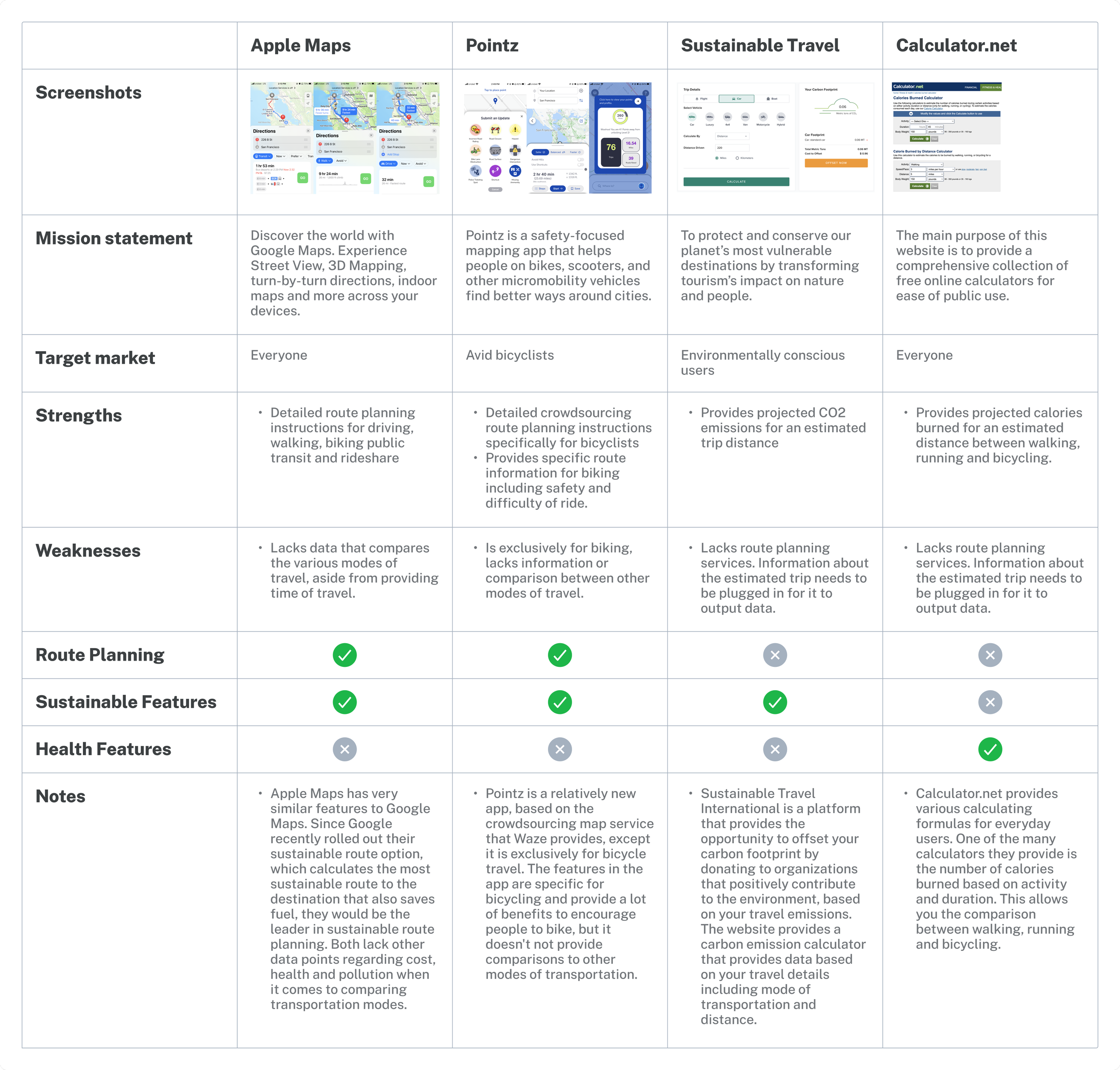 Competitive products were evaluated to understand what resources were available to understand how personal transportation impacted environmental sustainability. There were few existing products that brought data about both of these topics together.